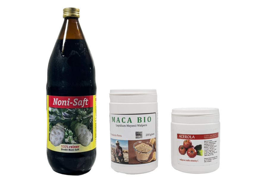 Kuracja składająca się z trzech suplementów Bio: Acerola, Maca i Sok Noni. Acerola to sproszkowany ekstrakt z owoców acerolii, owocu zwierającego ogromne ilości naturalnej witaminy C (niesyntetyzowanej). Organizm sam jej nie wytwarza, stąd trzeba ją regularnie uzupełniać. Witamina C to ważny antyutleniacz, działa silnie wzmacniająco na cały organizm i bardzo mocno odpornościowo, chroni też przed powstawianiem wielu chorób, w tym tych najgroźniejszych jak rak, czy choroby krążenia. Spowalnia też proces starzenia się komórek i skóry. Szczególnie zalecana przy przeziębieniach, stanach zapalnych, czy nowotworach. Maca to znana na całym świecie roślina andyjska, która ma bardzo szerokie zastosowanie, ale głównie pomaga odzyskać siły, poprawia wytrzymałość organizmu, oraz wspaniale reguluje w sposób naturalny układ hormonalny (szczególnie u kobiet podczas menopauzy). Działa także na aktywność plemników, stąd uważana jest za naturalny afrodyzjak i środek poprawiający płodność. W czasie radio- czy chemioterapii redukuje ich ujemne skutki, oraz pozwala odzyskać siły wyniszczonemu przez choroby organizmowi. Sok Noni – to prawdziwa bomba witaminowa. Sok posiada niezwykle silne właściwości przeciwbólowe, przeciwzapalne, antybakteryjne i antywirusowe. Oczyszcza też organizm, podnosi odporność, dodaje energii, regeneruje skórę i włosy, poprawia przemianę materii oraz wzmacnia psychikę i poprawia sen.